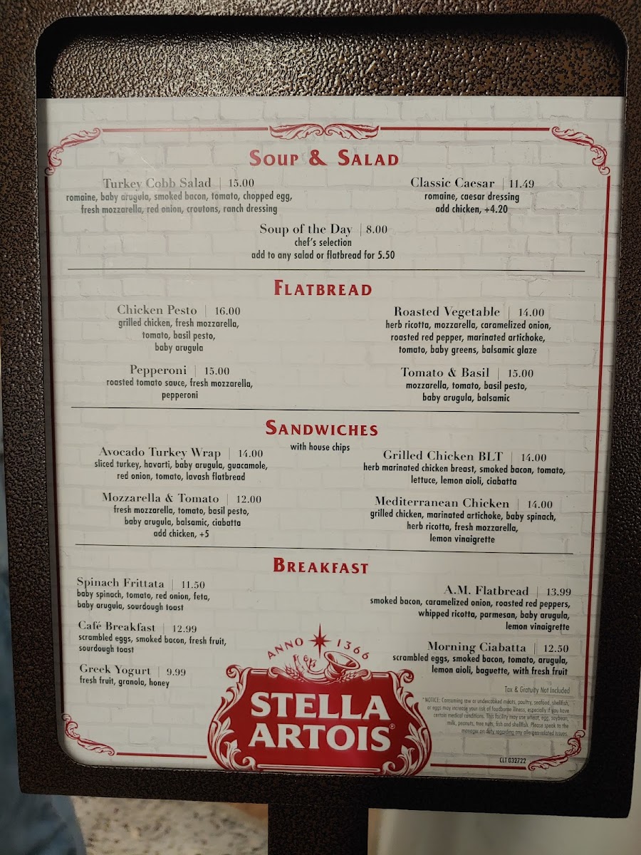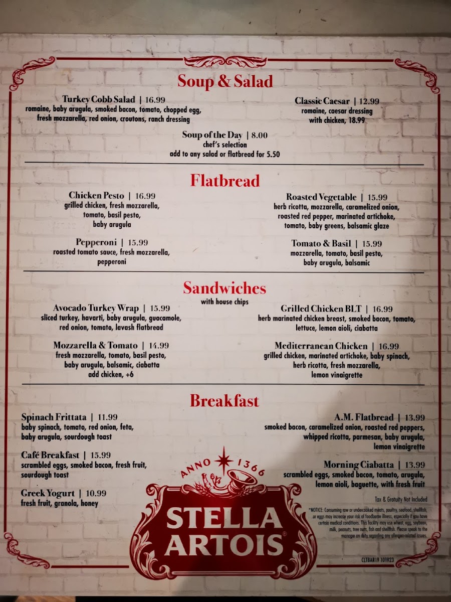 Soup & Salad options include seasonal and classic choices, such as the Turkey Cobb Salad, Soup of the Day, and Classic Caesar, providing fresh and varied selections for lighter meals.